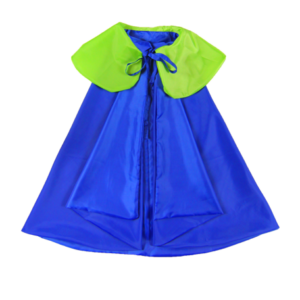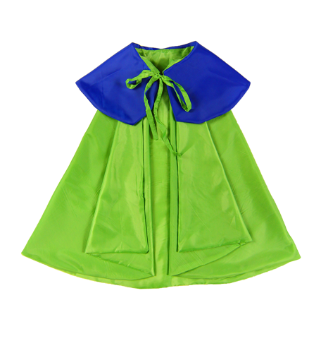 Strój zawiera pelerynę z zielonym kołnierzem i wygodne wstążeczki do zawiązania z przodu.