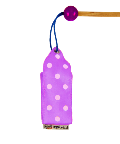 Materiał połączony jest z drewnianą tyczką kolorowym sznureczkiem, a tyczka zakończona jest po obu stronach drewnianymi kulkami, dzięki czemu wstążka idealnie pasuje do małych rączek i jest wygodna w użytkowaniu.